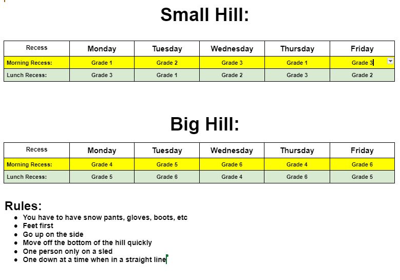 2. To reduce congestion and the risk of injury on the snow hills, students will only be allowed on the hill during their scheduled times.